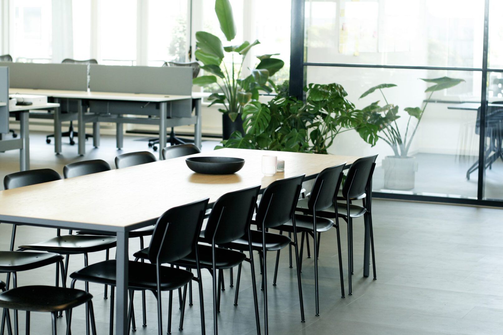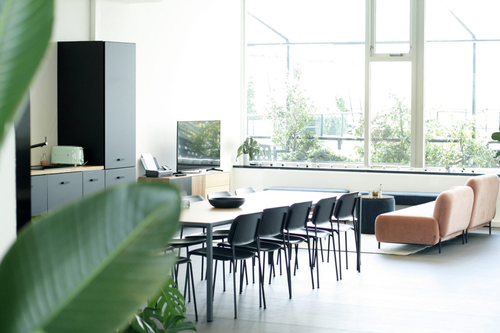 Op de wensenlijst van eigenaren Robbin en Maarten stond een grijze vloer, een zwarte keuken en, heel belangrijk, warmte & gezelligheid. Voor een goede werksfeer.